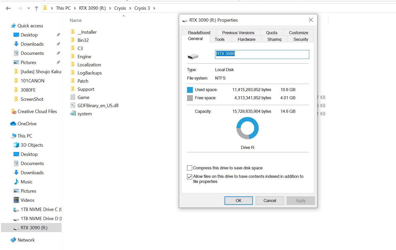 С помощью утилиты VRAM Drive ей удалось создать виртуальный накопитель объёмом 15 Гбайт, используя 24 ГБ памяти GDDR6X в составе GeForce RTX 3090, а также установить на него Crysis 3. Оставшиеся 9 Гбайт видеобуфера задействовались по прямому назначению в качестве графической памяти.
