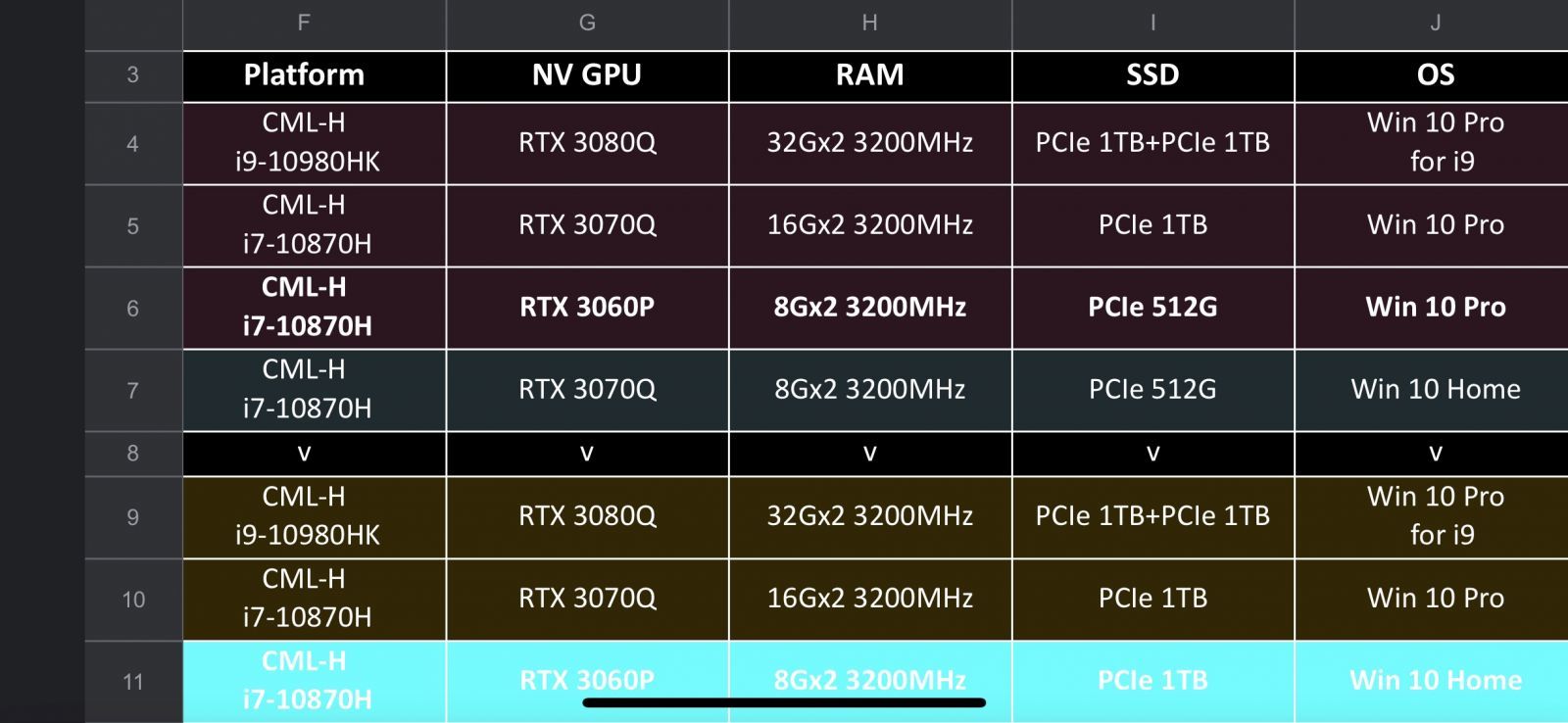 Если верить предоставленному слайду, то «зелёные» готовят к релизу ноутбучные видеокарты GeForce RTX 3080, GeForce RTX 3070 и GeForce RTX 3060. Старшие адаптеры будут доступны только в Max-Q версиях с урезанным TDP и частотами. Напомним, что у десктопных аналогов показатель TGP (Total Graphics Power) равен 320 и 220 Вт соответственно.