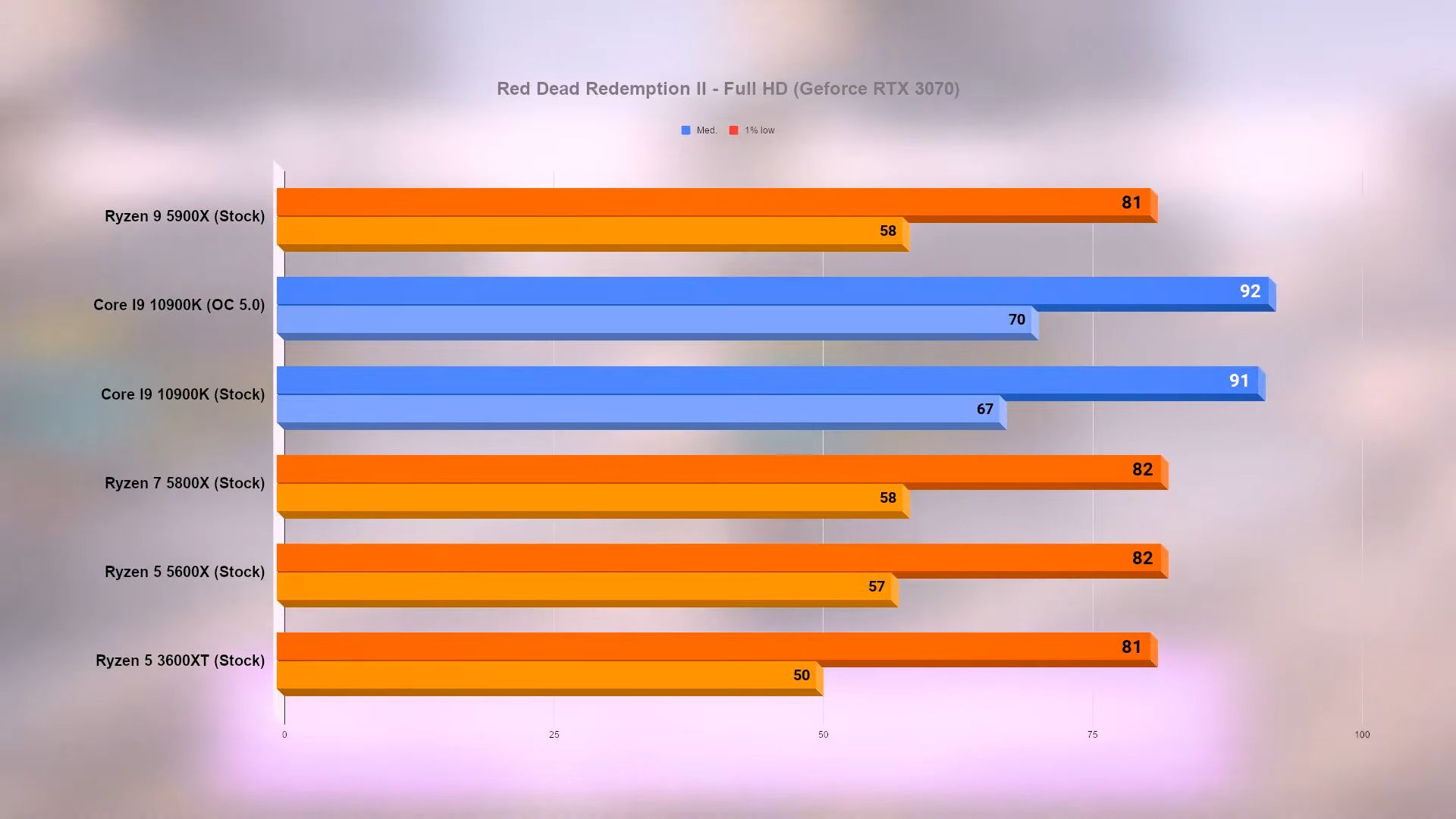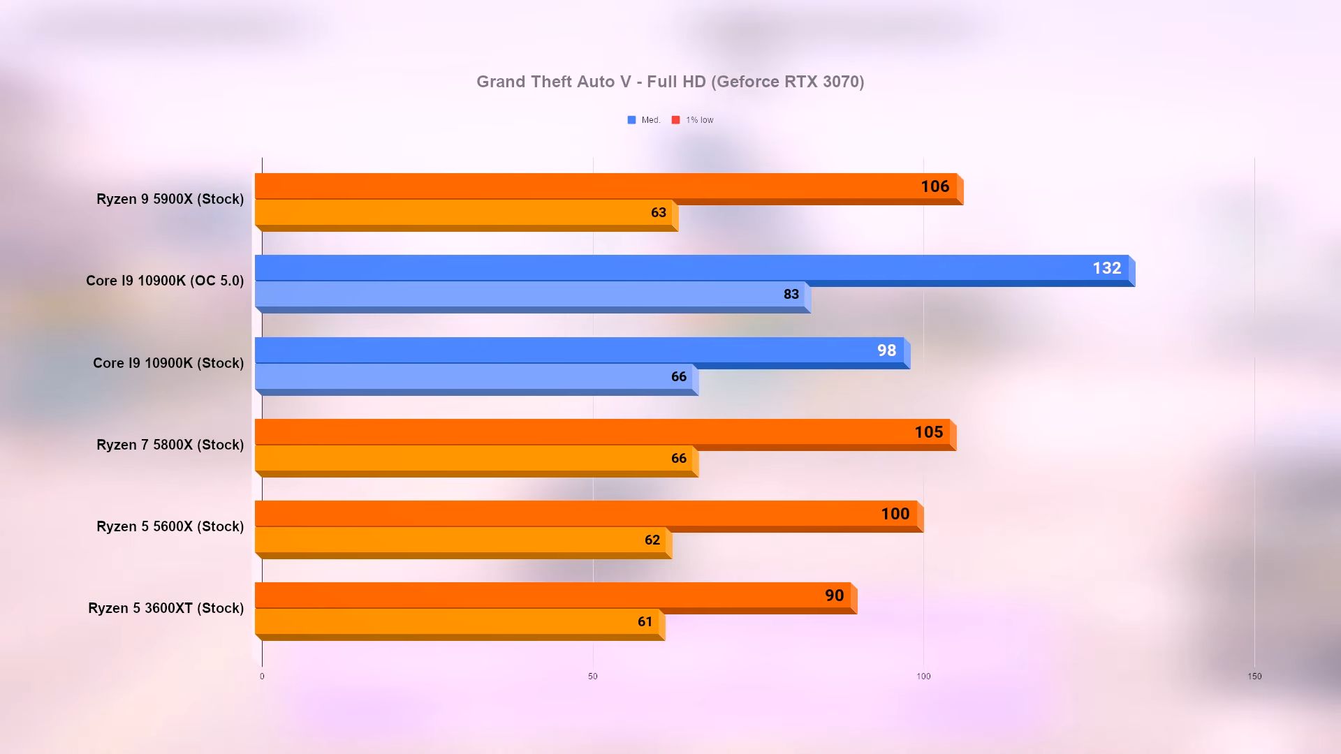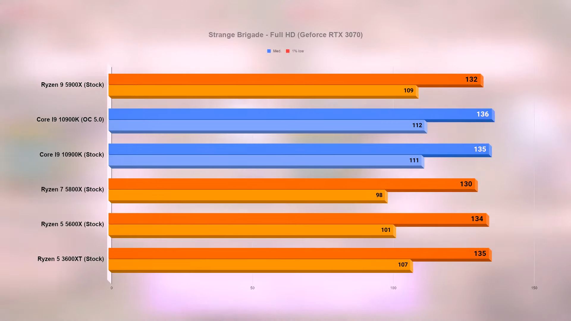 Для сравнения приведены результаты 10-ядерного Intel Core i9-10900K на штатных частотах и при разгоне до 5,0 ГГц, а также 6-ядерного AMD Ryzen 5 3600XT с архитектурой Zen 2. Во всех случаях использовались 16 Гбайт памяти DDR4-3600 и видеокарта GeForce RTX 3070. Тесты проводились в разрешении Full HD.