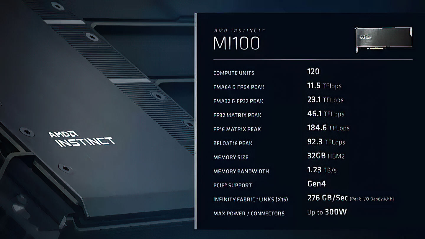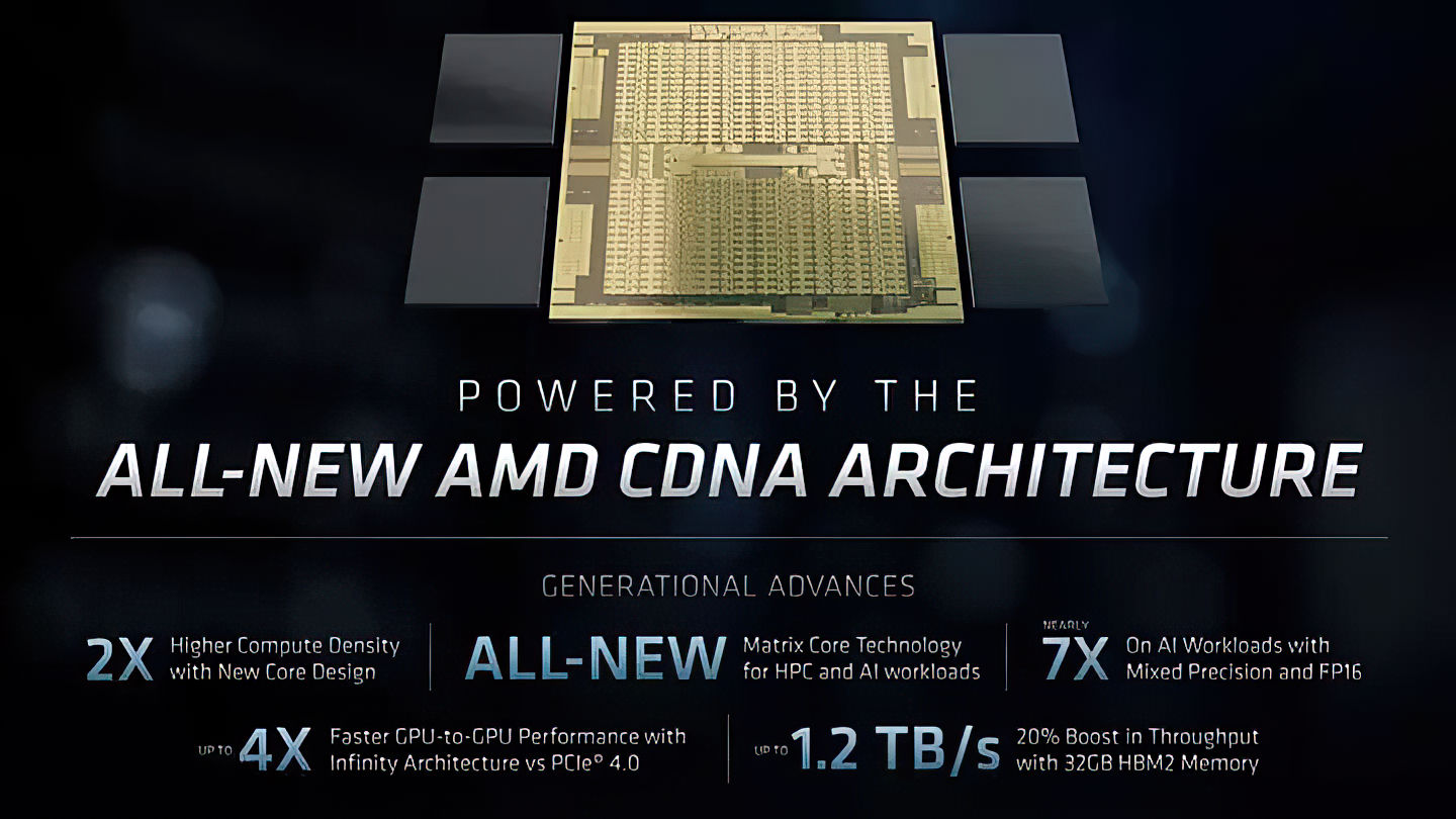 В арсенале AMD Instinct MI100 имеются 120 вычислительных блоков (Compute Units, CU) или 7680 потоковых процессоров, а также 32-гигабайтный буфер, набранный четырьмя стеками HBM2, с пропускной способностью 1,23 Тбайт/с.