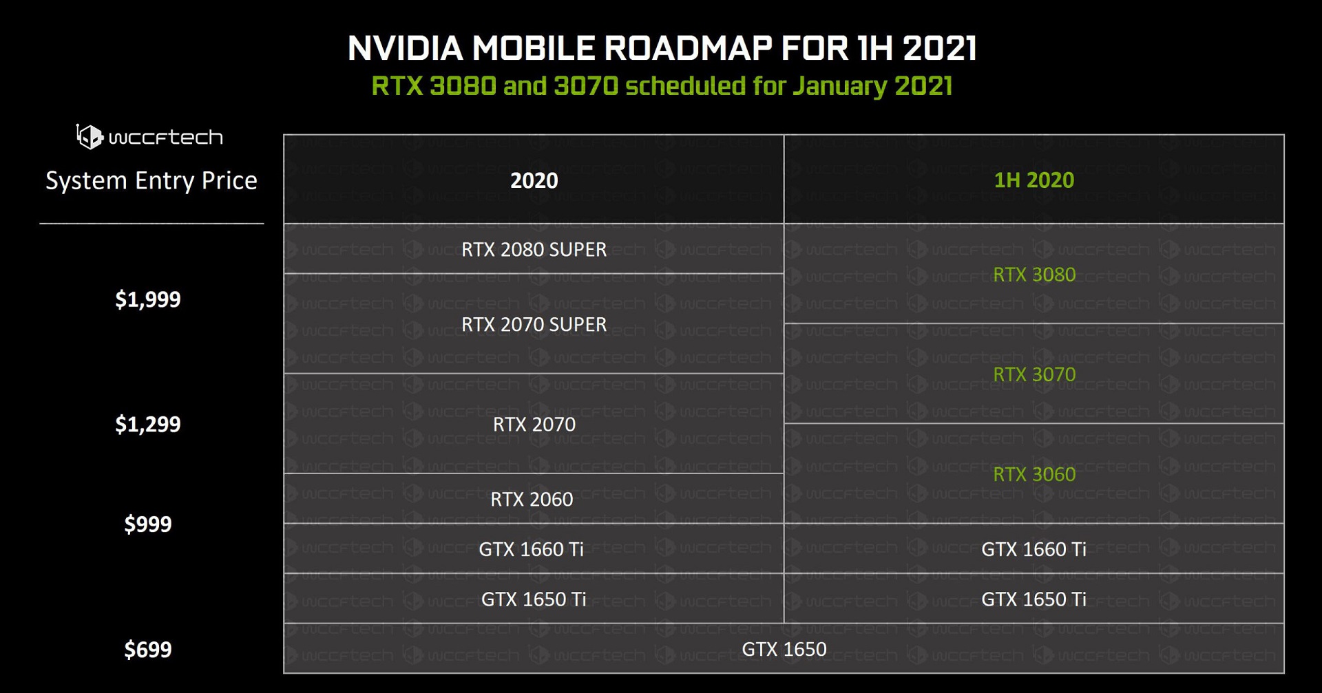 В январе 2021-го состоится дебют линейки мобильных видеокарт GeForce RTX 3000. Nvidia намерена представить три ускорителя: GeForce RTX 3080, RTX 3070 и RTX 3060. В сравнительно недорогих лэптопах для геймеров продолжат использоваться адаптеры GeForce GTX 16-й серии на графических процессорах Turing. Технические характеристики новых GeForce RTX пока остаются неизвестны, но они наверняка будут похожи на настольных сородичей.