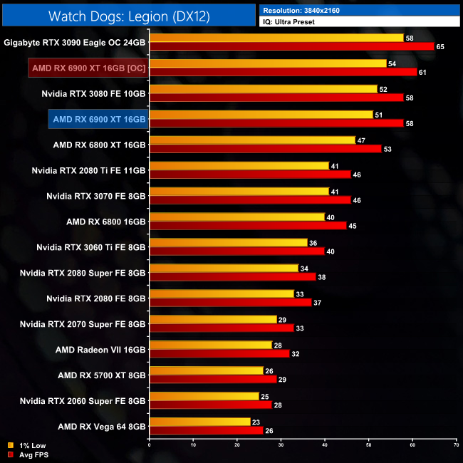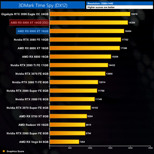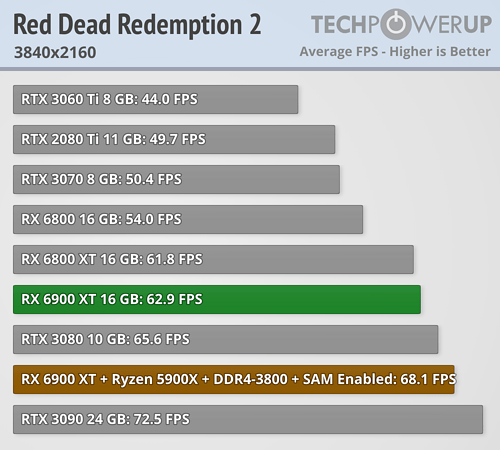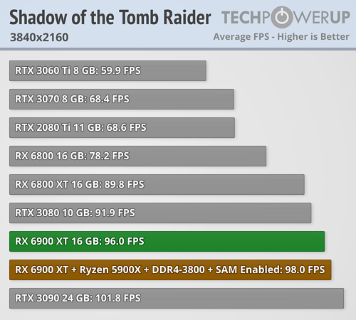Игровое быстродействие Radeon RX 6900 XT полностью соответствует её рекомендуемой цене — «большой Navi» занял нишу между GeForce RTX 3080 ($699) и GeForce RTX 3090 ($1499). Если сравнивать с Radeon RX 6800 XT, то новинка оказывается примерно на 7% быстрее.