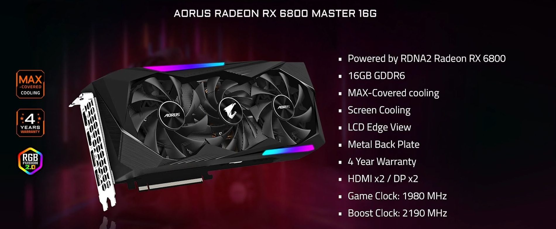 Видеокарту Radeon RX 6800 Aorus Master компания Gigabyte оценила в $719, что на 140 долларов больше цены референсной версии. В то же время Radeon RX 6800 XT в исполнении Gaming OC и Aorus Mater обойдутся минимум в 849 (+$200) и 899 (+$250) долларов.