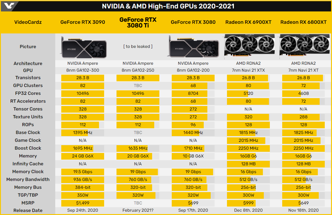 Повременить с дебютом GeForce RTX 3080 Ti, который изначально был запланирован на январь, чипмейкер решил после детального анализа решений конкурента. 3D-ускорители AMD Navi 21 не представляют сиюминутной угрозы доступным на рынке видеокартам GeForce RTX 3000, пусть и оснащены 16 ГБ памяти GDDR6.