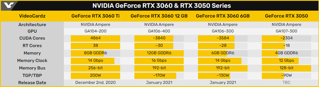 Здесь можно провести аналогию с GeForce GTX 1060 6GB и GTX 1060 3GB, которые отличались не только объёмом видеобуфера, но и конфигурацией графического ядра. В случае GeForce RTX 3060 6GB будет использован урезанный вариант кристалла GA106, а её официальный дебют состоится ближе к концу следующего месяца.