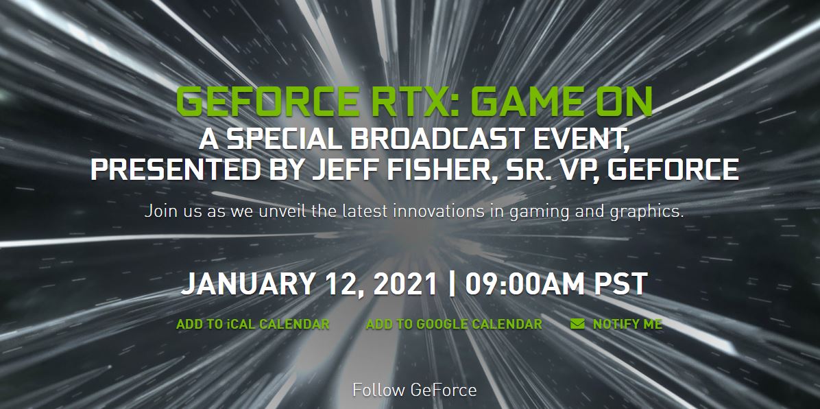 Вторая половина 2020-го выдалась богатой на «железячные» анонсы. Nvidia не намерена сбавлять темп и планирует начать следующий год со специальной трансляции «GeForce RTX: Game On», запланированной на 12 января. «Присоединяйтесь и узнайте о последних инновациях в области игр и графики», — сообщает пресс-служба Nvidia. К слову, в этот же день состоится выступление главы AMD Лизы Су в рамках CES 2021.