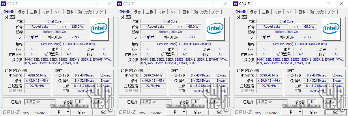 Инженерный экземпляр Intel Core i9-11900K работает на частоте от 3,4 до 4,8 ГГц в динамическом разгоне. Его штатный TDP соответствует другим оверклокерским чипам K-серии — 125 Вт. В то же время образцы Core i7-11700 и Core i9-11900 имеют номинальную частоту 1,8 ГГц, способны разгоняться до 4,4 и 4,5 ГГц. Теплопакет этих моделей равен 65 Вт.