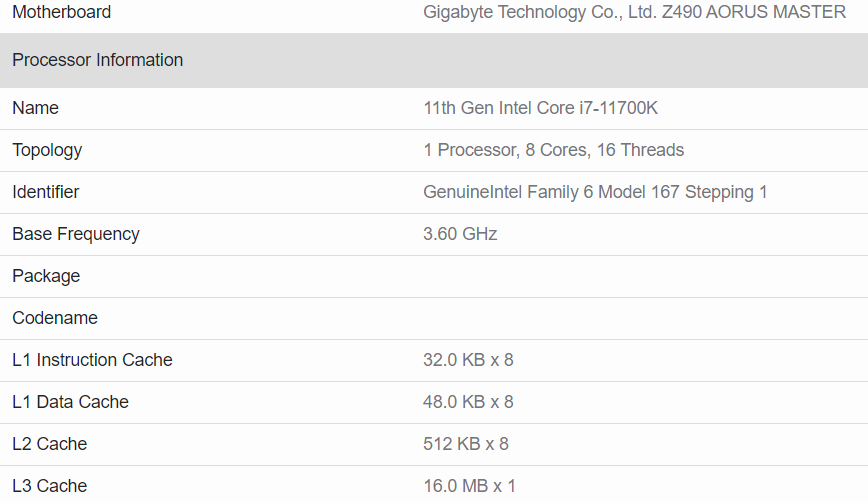Вслед за тестами инженерных образцов в Сети начинают появляться бенчмарки финальных версий процессоров Intel Rocket Lake-S. Один из таких CPU был замечен в онлайн-базе Geekbench. Свежая запись посвящена 8-ядерному/16-поточному Intel Core i7-11700K, который был испытан на материнской плате Gigabyte Z490 Aorus Master.