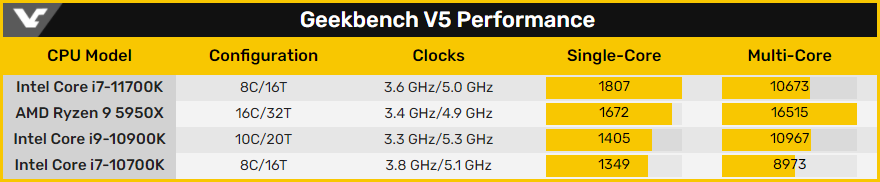 Тест Geekbench 5 ещё не вышедший Intel Core i7-11700K завершил с результатом в 1807/10673 балла (Single-Core/Multi-Core Score). С ориентировочными показателями других процессоров можно ознакомиться в таблице ниже.