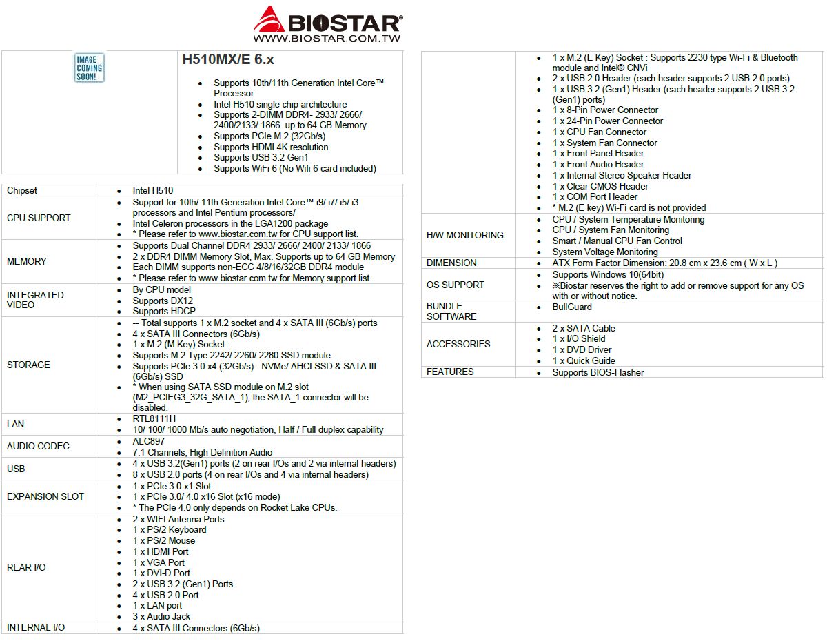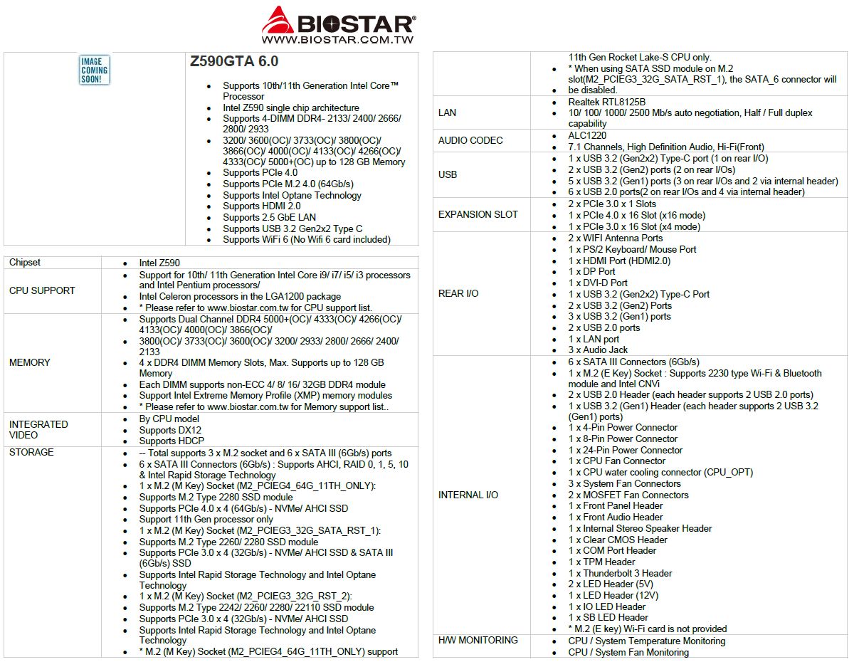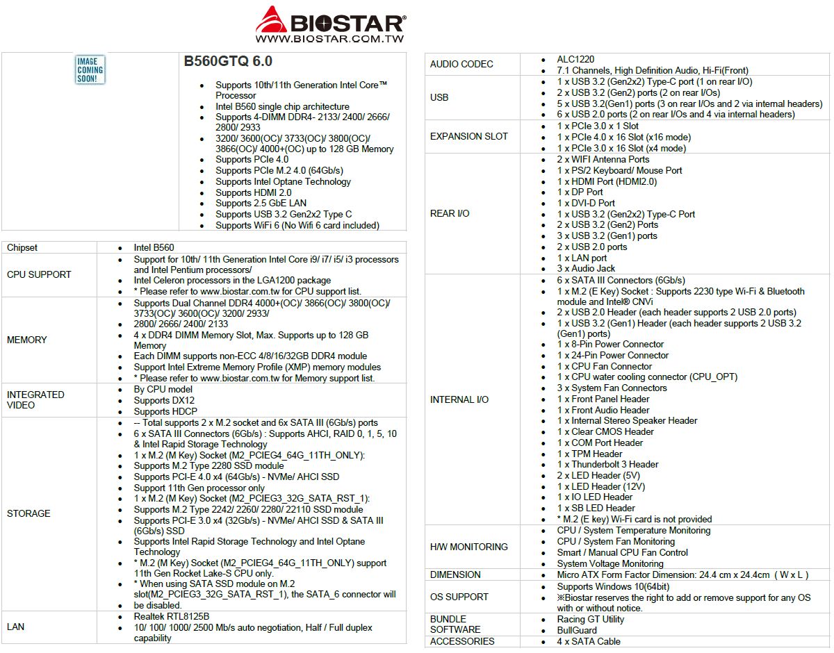 Для одной из будущих плат Biostar B560 заявлена поддержка до 128 Гбайт оперативной памяти DDR4 с эффективной частотой вплоть до 4000 МГц. В то же время изделия H510 ограничатся режимом DDR4-2933, а разгон CPU останется уделом топового чипсета Z590.