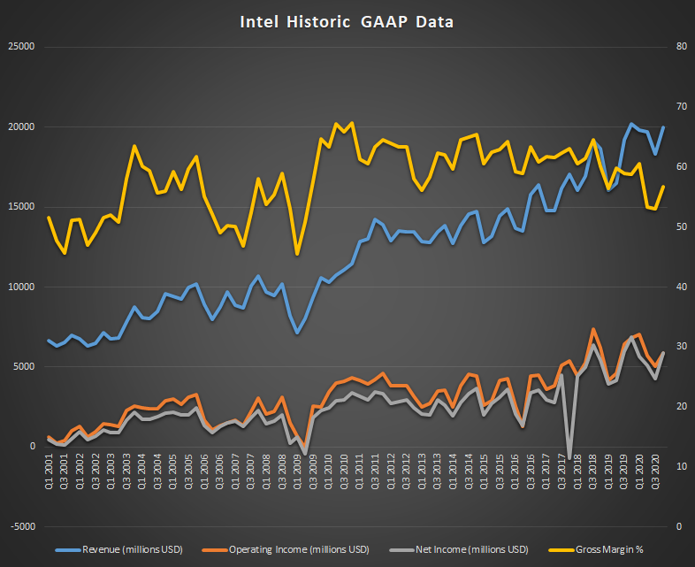 Выручка Intel (млн долл., синяя кривая), валовая рентабельность (%, жёлтая кривая), операционная прибыль (млн долл., оранжевая кривая) и чистая прибыль (млн долл., серая кривая)