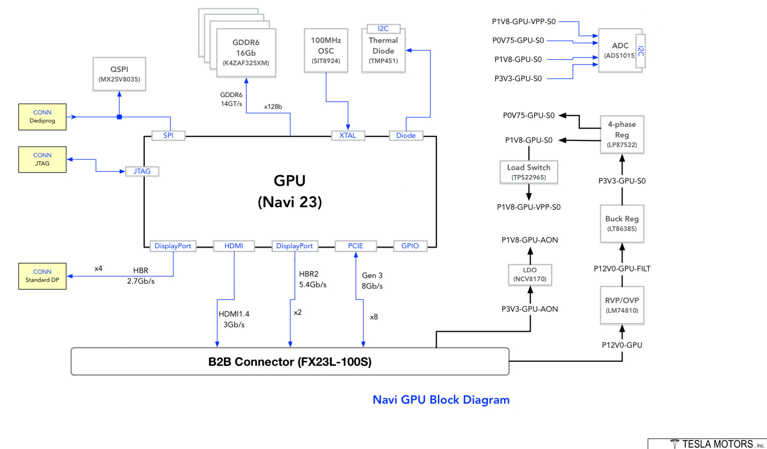По просочившейся информации, Tesla Arcade основана на графическом чипе AMD Navi 23. Известный инсайдер Патрик Шур (Patrick Schur) опубликовал электрическую структурную схему Tesla Motors, подтверждающую данный факт.