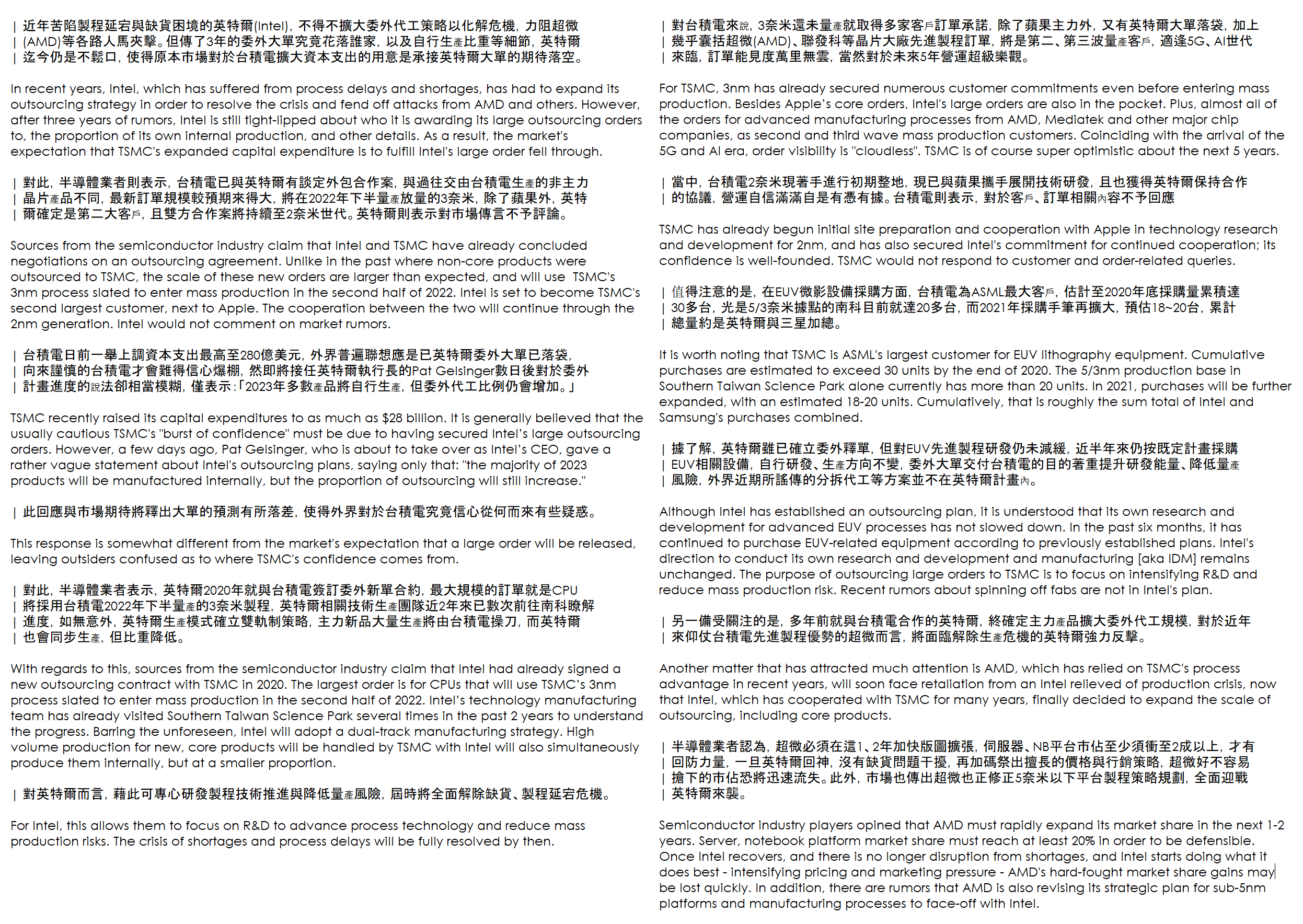 В недавнем отчете DigiTimes утверждается, что Intel подписала соглашение с TSMC о контрактном выпуске CPU и других электронных компонентов по 3-нм техпроцессу, начиная со второй половины 2022 года. Ожидается, что собственное полупроводниковое производство Intel сохранится, хотя и в меньших количествах.