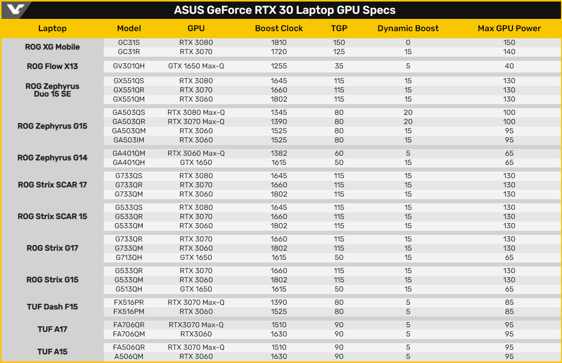 ASUSTeK Computer решила последовать примеру компании MSI, обнародовав детальные характеристики видеоадаптеров GeForce RTX 3000, используемых в ноутбуках линеек ROG и TUF. Более того, вендор теперь приводит их в спецификациях лэптопов на официальном сайте, указывая рабочие частоты и номинальный уровень TGP для каждой из моделей.