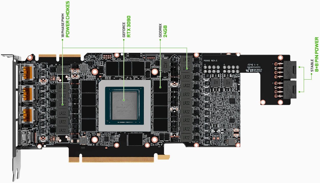 В основе устройства лежит печатная плата референсного дизайна, у которой два 8-контактных разъёма дополнительного питания размещены на небольшом «отростке». Графический процессор GA102 функционирует на рекомендованных Nvidia частотах — от 1395 до 1695 МГц в динамическом разгоне. Для вывода изображения предусмотрены три интерфейса DisplayPort 1.4 и один HDMI 2.1.