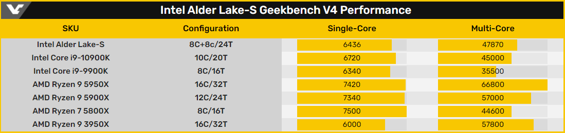 В таблице выше наши коллеги из VideoCardz собрали медианные результаты Geekbench 4 ряда актуальных процессоров. Как видим, по одноядерному быстродействию инженерный образец Alder Lake-S опередил Core i9-9900K, а в «многопотоке» он обходит Core i9-10900K, нынешнего флагмана платформы LGA1200.