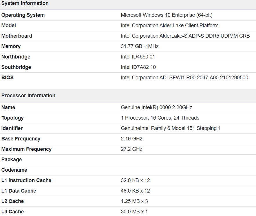 В онлайн-базе Geekbench «засветился» топовый вариант Alder Lake-S с 16 ядрами/24 потоками и номинальной частотой 2,19 ГГц. Такая необычная конфигурация объясняется поддержкой технологии Hyper-Threading только «большими» ядрами Golden Cove. Частота boost-режима CPU была определена бенчмарком как 27,2 ГГц, что, разумеется, является ошибкой.