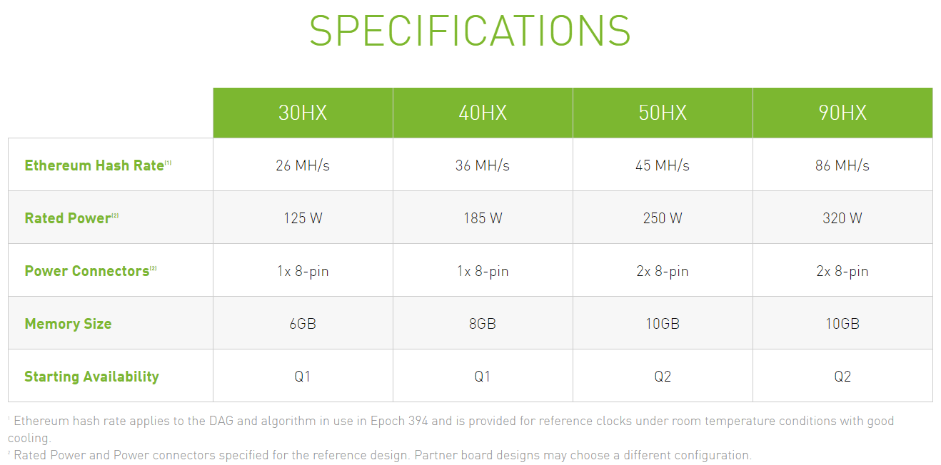 Специально для майнеров Nvidia готовит отдельную серию устройств под названием CMP HX. Эти ускорители являются преемниками видеокарт Pascal P10X, выпущенных в период «криптовалютной лихорадки» три года назад. В основе новинок, судя по характеристикам, лежат графические ядра Nvidia Ampere. Производительность в добыче Ethereum составляет от 26 до 86 MH/s в зависимости от устройства.