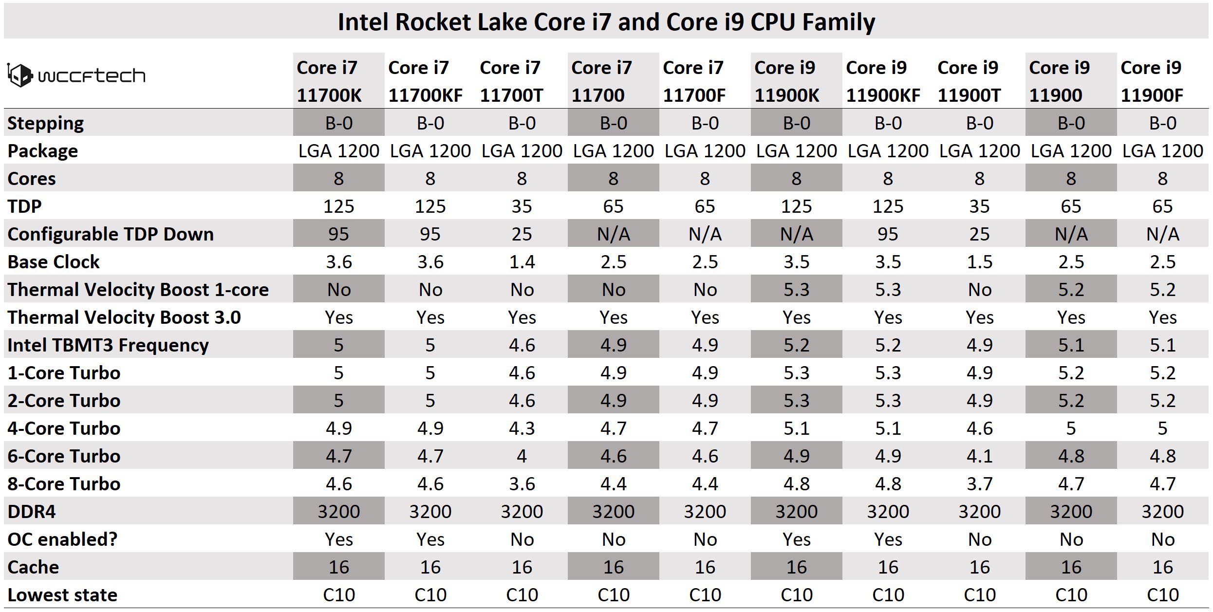 В распоряжении портала WCCFTech оказались детальные характеристики 8-ядерных процессоров Intel Core 11-го поколения для настольных ПК. Речь идёт о чипах Core i7/i9, среди которых есть модели с разблокированным множителем, деактивированной графикой и 35-ваттным теплопакетом. Все они принадлежат к 14-нм семейству Rocket Lake-S и будут представлены в середине этого месяца.
