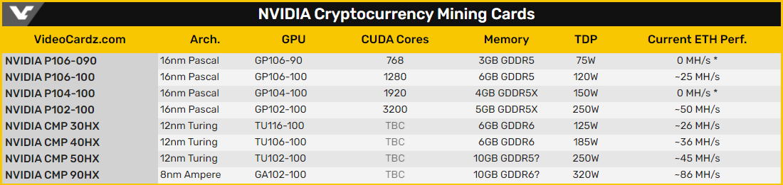 На фоне игровых сородичей эти ускорители выделяются отсутствием видеовыходов и зачастую оснащены максимально простой системой охлаждения. В майнинге их производительность соответствует видеокартам GeForce GTX 1060. Стоит добавить, что в этом месяце выйдут первые устройства линейки Crypto Mining Processor (CMP), основанные на 12-нм GPU Nvidia Turing.