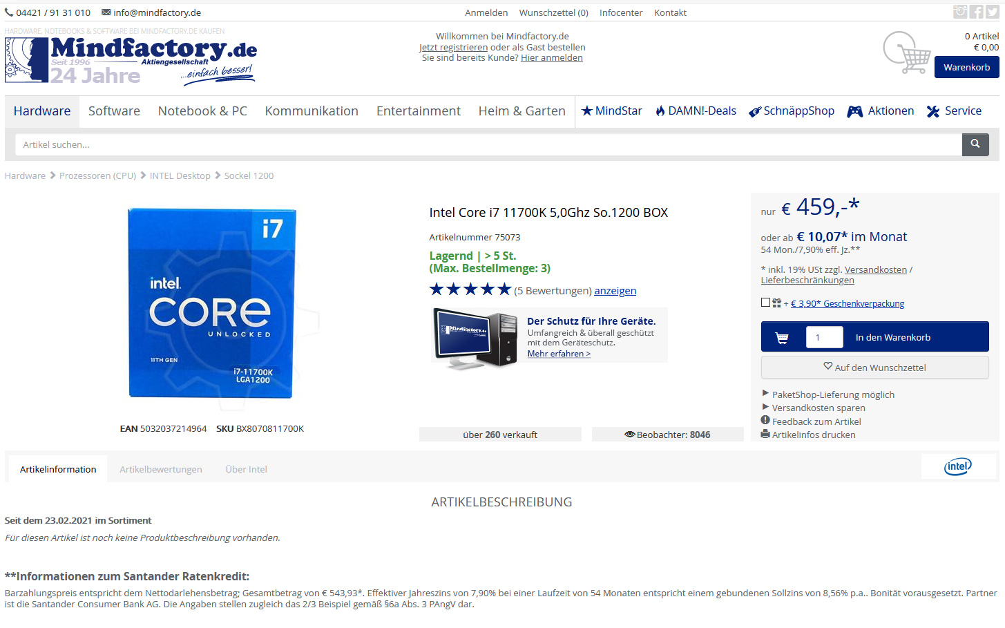 Немецкий магазин техники Mindfactory возобновил продажи еще не анонсированного процессора Intel Core i7-11700K. Две недели назад эту модель уже можно было приобрести в Mindfactory, чем успели воспользоваться некоторые европейские покупатели и даже редакции известных технических ресурсов.