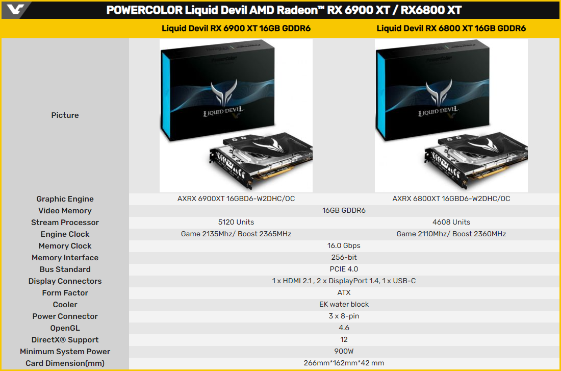Корпорация TUL, известная под брендом PowerColor, анонсировала поступление в продажу видеокарт Radeon RX 6800 XT и Radeon RX 6900 XT серии Liquid Devil. Отличительной чертой этих моделей является предустановленный водоблок полного покрытия. Новинки также могут похвастаться платой альтернативного дизайна и заводским разгоном графического ядра AMD Navi 21.