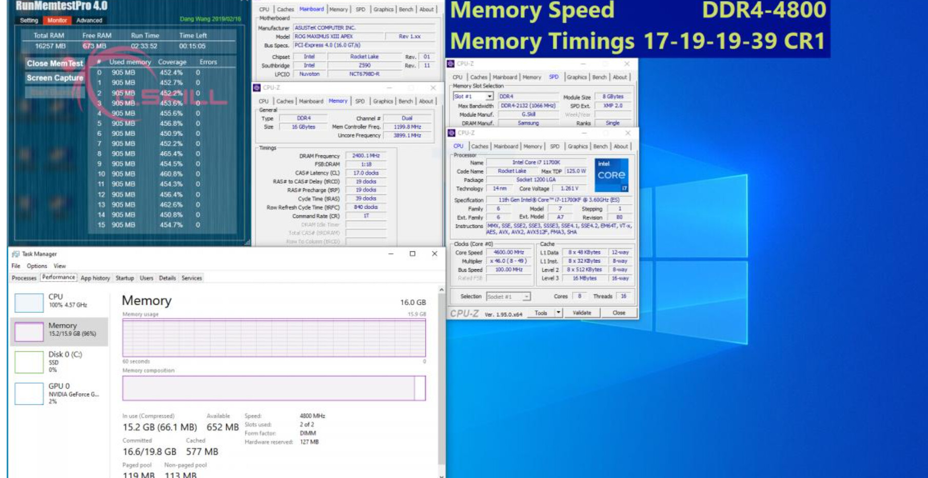 Безусловно, внимания заслуживает не только упомянутый выше набор. Дополнительно можно выделить комплект DDR4-4800 16 ГБ (8 ГБ x 2) с формулой таймингов CL17-19-19-39, созданный с использованием лучших микросхем Samsung B-die. В первую очередь он придется по душе геймерам. Комплект был протестирован на материнской плате ASUS ROG Maximus XIII Apex с процессором Core i7-11700KF.