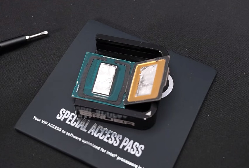 В процессорах Core 11-го поколения Intel продолжила использовать припой между кристаллом и теплораспределителем. Однако выросшая площадь чипа вместе с появлением SMD-компонентов значительно усложнила процесс снятия крышки. Как показал эксперимент с Core i7-11700K, «убить» CPU Rocket Lake-S достаточно легко. Чтобы сохранить работоспособность Core i9-11900K в ходе эксперимента, Роману пришлось расплавить припой, разогрев CPU до 170°C в обычной духовке.