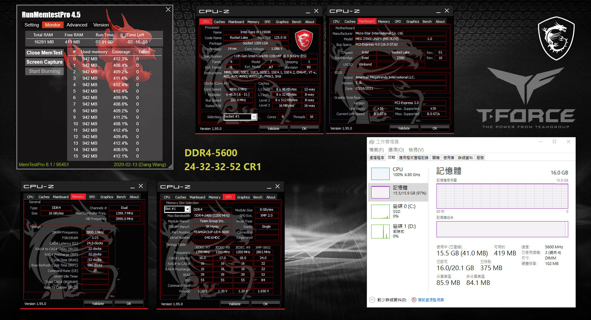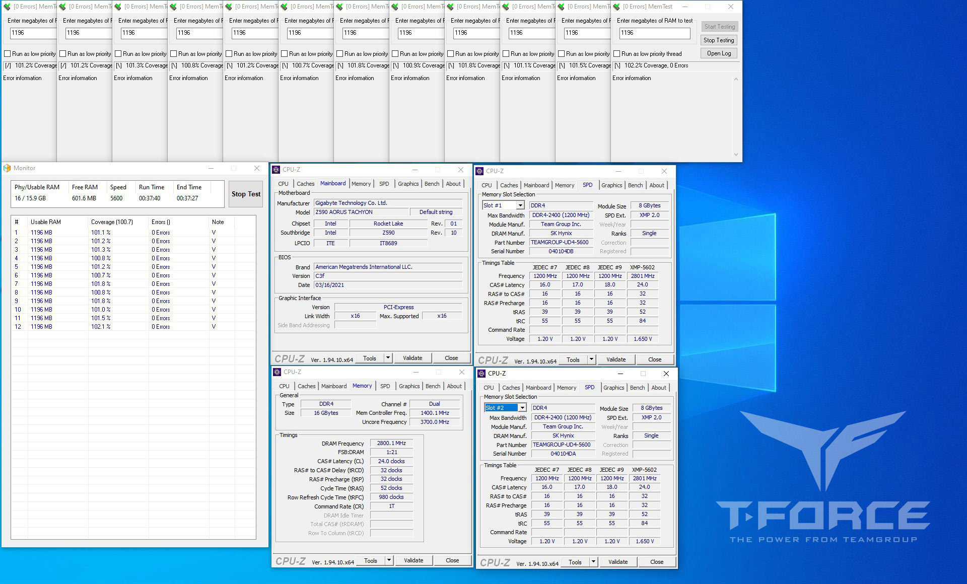 Для вышеупомянутого набора DDR4-5600 характерно напряжение питания 1,65 В и формула задержек 24-32-32-52. В качестве доказательства высокой стабильности работы Team Group привела скриншоты, сделанные на компьютерах с материнскими платами ASRock, ASUS, Gigabyte и MSI. Основой бенч-стендов во всех случаях выступает 8-ядерный/16-поточный «камень» Intel Core i9-11900K.
