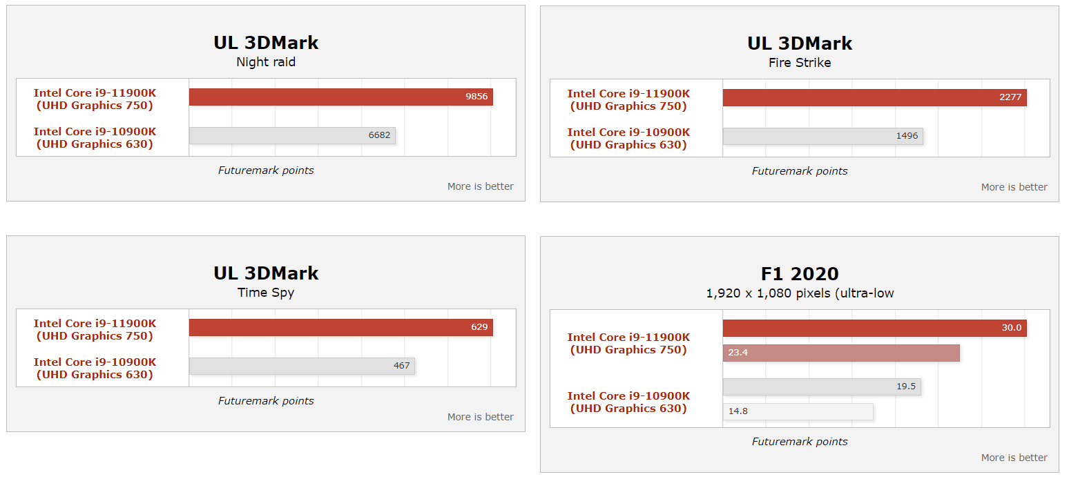 Видеоядро UHD 750 в составе настольных процессоров Core 11-го поколения содержит до 32 исполнительных модулей Xe-LP. Как показали независимые тесты, новая архитектура принесла ощутимый прирост быстродействия встроенной графики. Отметим, что для замеров производительности использовалась предварительная версия драйвера, разосланная крупным изданиям.