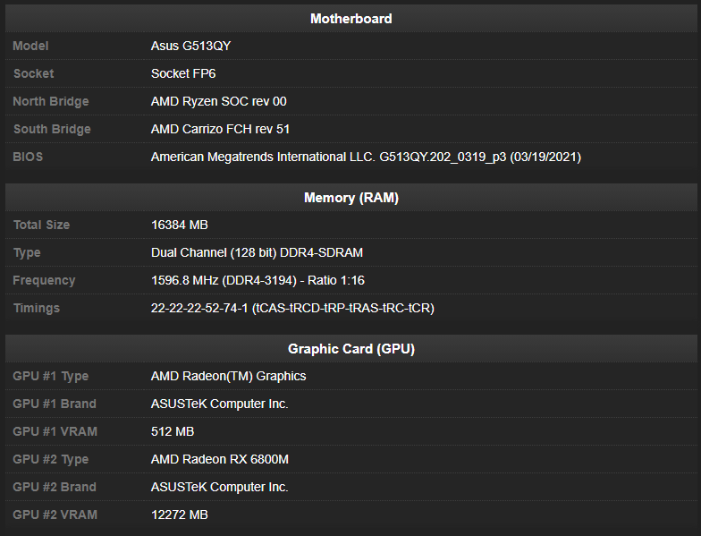 Упомянутый ноутбук был обнаружен в онлайн-валидаторе CPU-Z. К сожалению, утилита не раскрыла характеристики Radeon RX 6800M, за исключением объёма видеобуфера — 12 Гбайт. Согласно предыдущим утечкам, в основу новинки ляжет 7-нм графический чип Navi 22, знакомый по настольной видеокарте Radeon RX 6700 XT. В его арсенале имеются 2560 потоковых процессоров, 40 блоков Ray Accelerators, 96 Мбайт Infinity Cache и 192-разрядный интерфейс памяти.