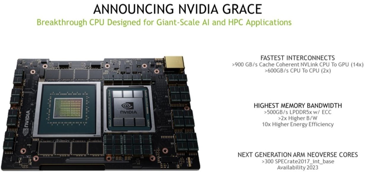 В рамках онлайн-конференции GTC 2021 состоялся анонс процессора Nvidia Grace, названного в честь американской учёной Грейс Хоппер (Grace Hopper). Он разрабатывается с прицелом на ресурсоёмкие вычисления и системы искусственного интеллекта, а его фактический релиз запланирован на 2023 год. Как утверждает чипмейкер, в этих задачах он «обеспечит в 10 раз большую производительность по сравнению с самыми быстрыми на сегодня серверами».