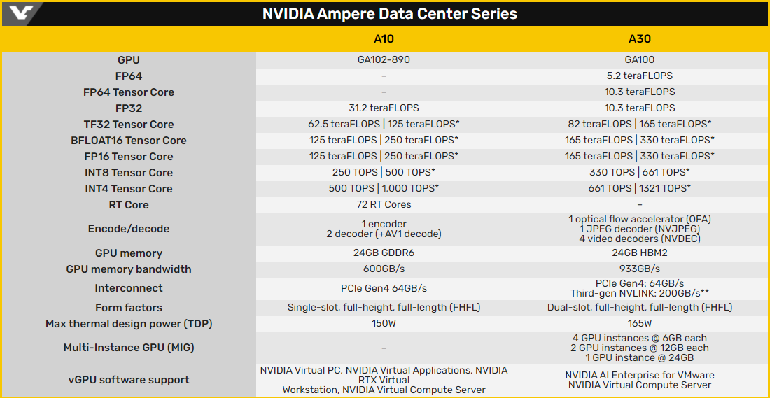 Основой ускорителя Nvidia A10 послужил графический процессор GA102, знакомый по игровым видеокартам GeForce RTX 3080/3090. К сожалению, чипмейкер не спешит раскрывать детальные характеристики устройства. Известно, что оно оперирует 24 гигабайтами памяти GDDR6 с пропускной способностью 600 Гбайт/с и обладает вычислительной мощностью 31,2 Тфлопс в операциях FP32.