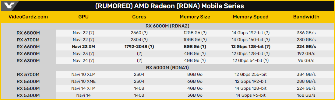Детальная спецификация AMD Radeon RX 6600M пока не была подтверждена. Известно, что кристалл Navi 23 физически содержит 2048 потоковых процессоров, буфер Infinity Cache объёмом 32 МБ и 128-битный интерфейс памяти. Таблица с предварительными характеристиками мобильных видеокарт Radeon RX 6000M, собранная веб-ресурсом VideoCardz на основе утечек, приведена ниже.