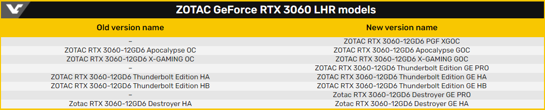 Для видеокарт GeForce RTX 3060 на ядре Nvidia GA106-302 компания Zotac предусмотрела новую маркировку. Определить такие 3D-ускорители можно будет по символам «G» или «GE» в названии, к примеру, Zotac RTX 3060-12GD6 Thunderbolt Edition GE HA.