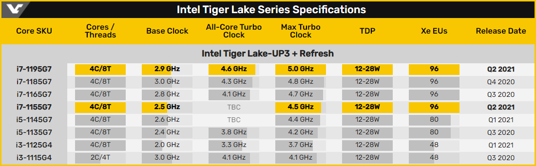 Intel Core i7-1195G7 и Core i5-1155G7 оперируют четырьмя ядрами на архитектуре Willow Cove с поддержкой Hyper-Threading, встроенной графикой Xe-LP на 96 исполнительных блоков и обладают настраиваемым TDP в диапазоне 12-28 Вт. Отличия между новинками сводятся к рабочим частотам: от 2,5 до 4,5 ГГц для Core i5 и от 2,9 до 5,0 ГГц для представителя серии Core i7.