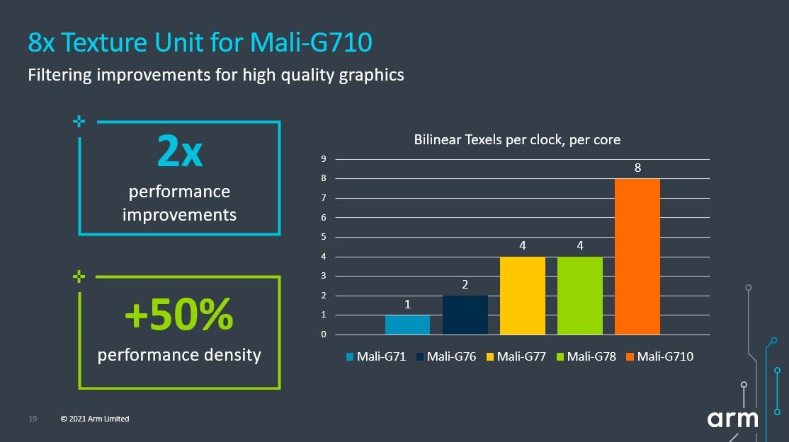 Флагманский графический процессор ARM Mali-G710 ориентирован на смартфоны премиум-класса. В играх он оказывается как минимум на 20% производительнее своих предшественников. Несколько упрощенной версией Mali-G710 является Mali-G610, но все равно это решение высокого класса для игровых смартфонов.