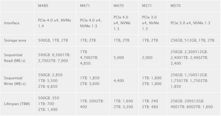 Флагманская серия Spatium M480 представлена устройствами объёмом 500 ГБ, 1 ТБ и 2 ТБ. Они оснащены интерфейсом PCI Express 4.0 x4 и обеспечивают скорости последовательного чтения и записи до 7000 и 6850 Мбайт/с соответственно. Уровень быстродействия при работе с произвольными блоками достигает 650 тыс./750 тыс. IOPS.