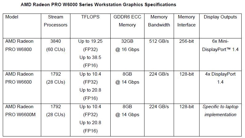 Мобильная Radeon Pro W6600M наследует характеристики десктопной «сестры», но при этом её энергопотребление будет находиться в диапазоне от 65 до 90 Вт в зависимости от ноутбука.