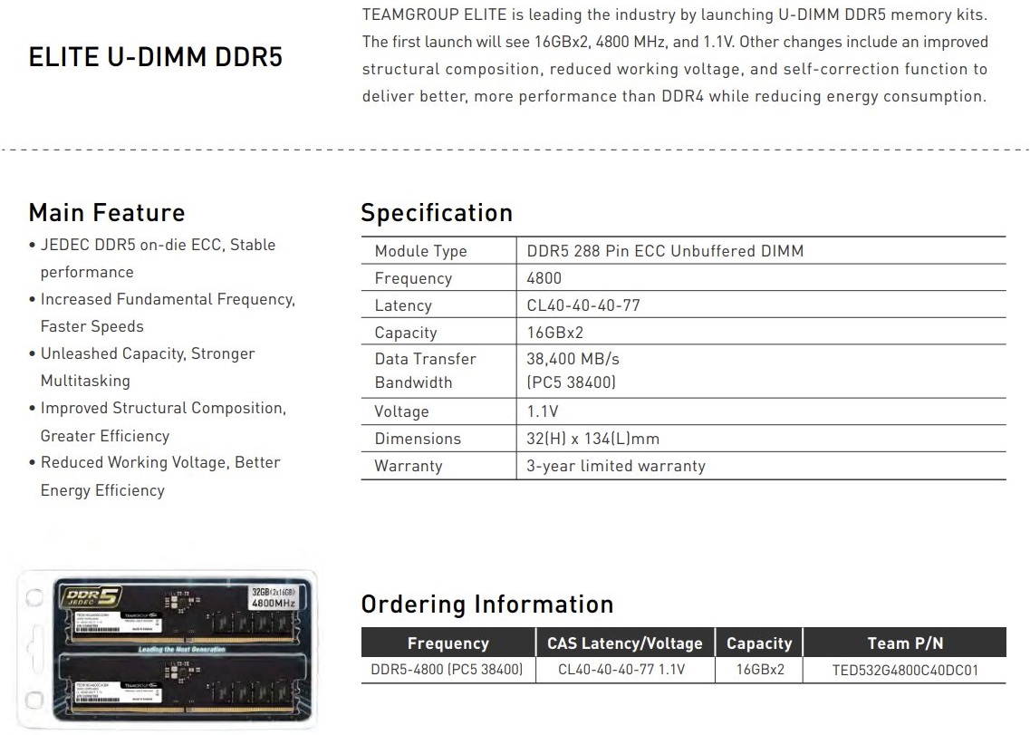 Компания Team Group решила не дожидаться релиза платформы Intel LGA1700 с поддержкой оперативной памяти DDR5 и официально выпустила 32-гигабайтный (2x 16 ГБ) набор DDR5-4800 серии Elite. В продажу он поступит ориентировочно в конце этого или начале следующего месяца по рекомендованной цене 400 долларов.