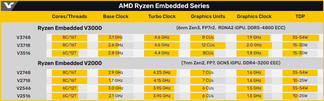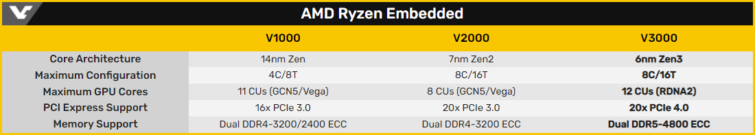 Модельный ряд чипов AMD Ryzen Embedded V3000 будет представлен решениями с 6-8 ядрами Zen 3. Гибридные процессоры работают с памятью DDR5-4800 (ECC) в двухканальном режиме, обзавелись контроллером PCI Express 4.0 на 20 линий и графическим блоком RDNA 2-го поколения на 12 Compute Units.
