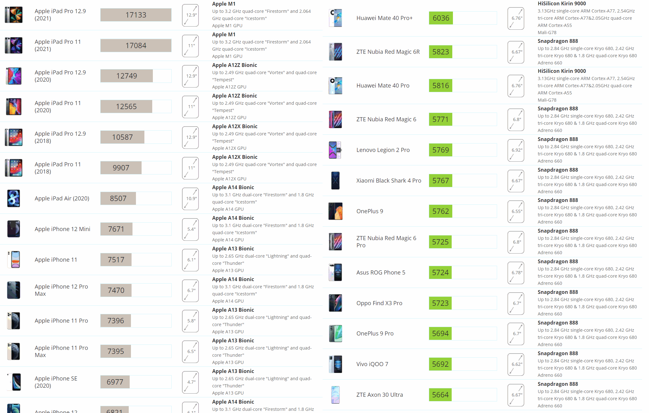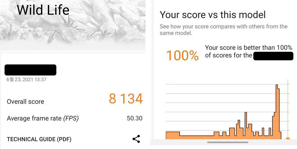 Безымянная SoC Samsung Exynos базируется на архитектуре ARM Cortex A77 и сумела набрать 8134 «попугая» в 3DMark Wild Life. Для сравнения, результат топовых Android-смартфонов находится у отметки в 6000 баллов, тогда как Apple iPhone с процессором A14 Bionic проходят бенчмарк с ~7,5 тысячами очков. Новинка уступила разве что «яблочным» планшетам, причём iPad Pro на базе Apple M1 обходят её более чем в два раза.