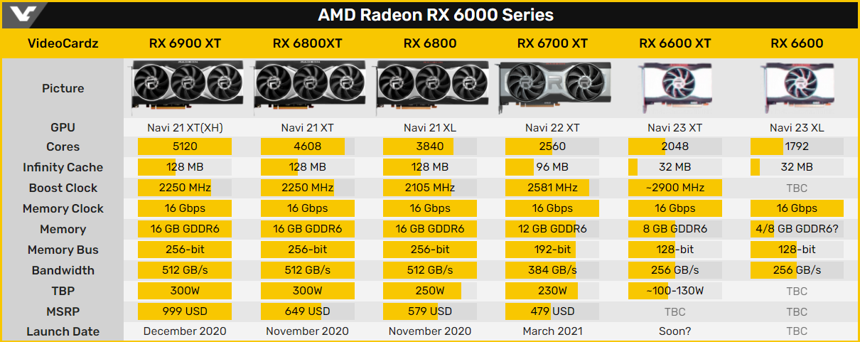 Технические характеристики Radeon RX 6600 XT были рассекречены ещё весной благодаря многочисленным утечкам. Основой видеокарты послужил графический чип Navi 23 с 2048 потоковыми процессорами, буфером Infinity Cache объёмом 32 МБ и 128-разрядной шиной памяти. Устройство оснащается 8 гигабайтами GDDR6 с эффективной частотой 16 ГГц. Эталонный вариант Radeon RX 6600 XT получил 8-контактный разъём дополнительного питания.