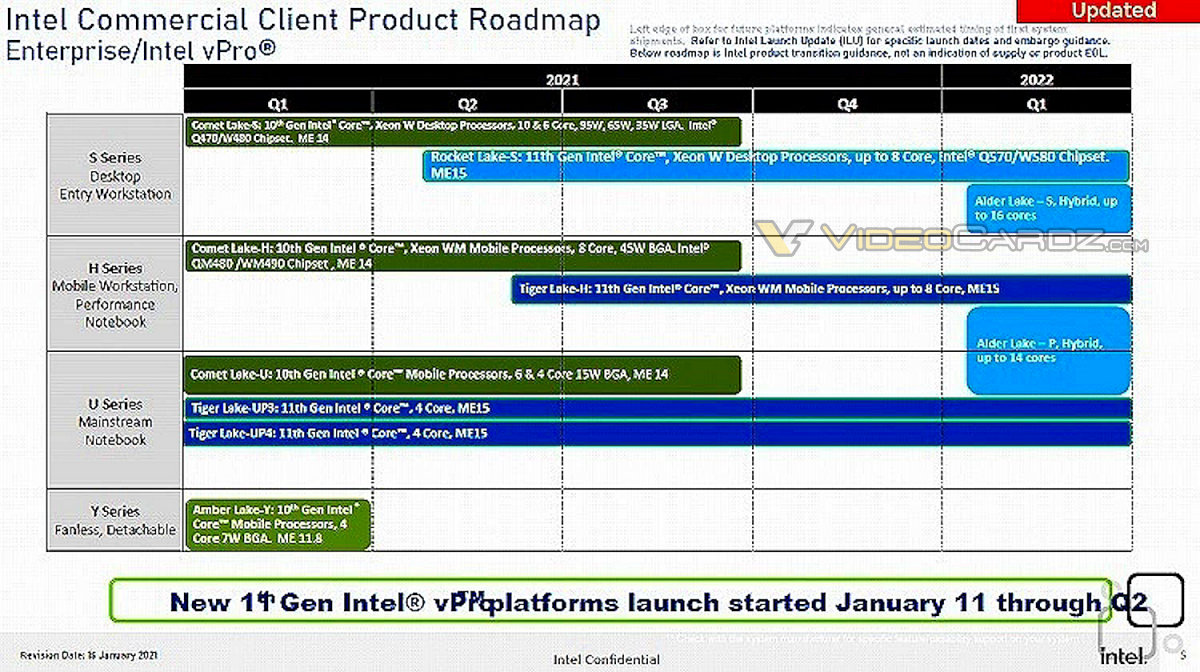 Согласно просочившейся дорожной карте, Intel намерена обновить свои продукты vPro для коммерческих клиентов в первом квартале следующего года. Роадмап явно не самый последний, но дата, указанная на слайде, относится к началу 2021 года (16 января). Качество изображения тоже не самое лучшее, однако позволяет четко понять, что выход Alder Lake-S и Alder Lake-P запланирован на первый квартал 2022 года.