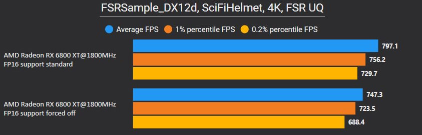 Выяснилось, что графический процессор Navi 21 демонстрирует на 7% более высокую производительность при использовании FSR в режиме FP16. Другими словами, наибольший прирост быстродействия от активации FidelityFX Super Resolution получат владельцы современных видеокарт с поддержкой вычислений половинной (FP16) точности.
