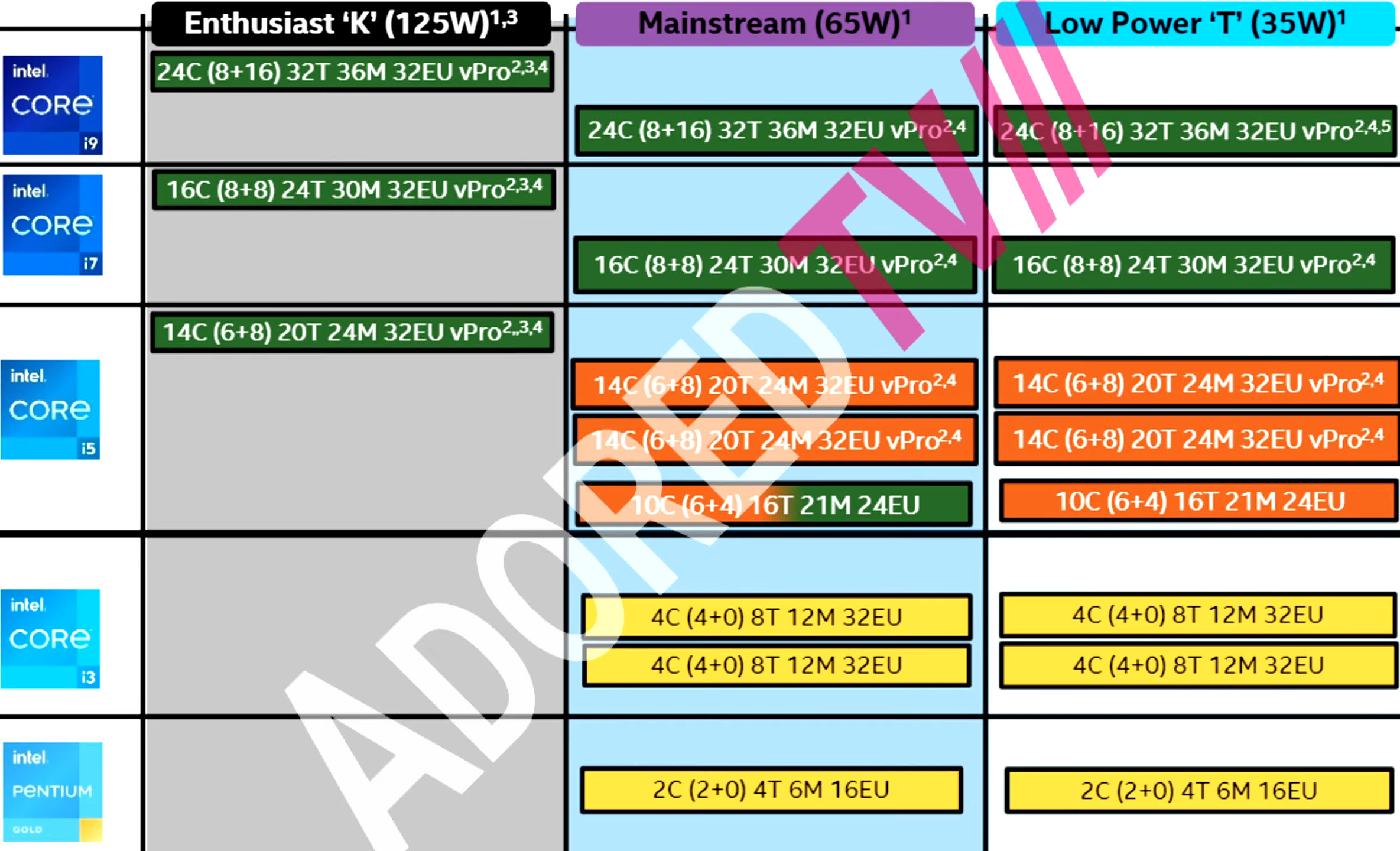 В чипах Core 13-го поколения Intel продолжит использовать гибридную архитектуру, объединив в одном кристалле 8 высокопроизводительных ядер с Hyper-Threading, 16 энергоэффективных ядер, 36 Мбайт кэш-памяти L3 и графический модуль на 32 исполнительных блока (Execution Units, EU). Штатный TDP останется на том же уровне, что и у решений Core 12-го поколения, правда, фактическое энергопотребление у Raptor Lake-S всё же вырастет.