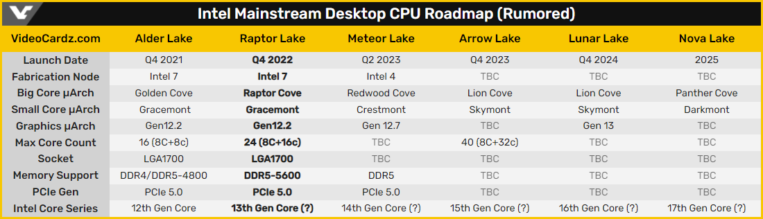В последнем квартале 2022 года корпорация Intel планирует выпустить настольные процессоры Core 13-го поколения (Raptor Lake-S). Они будут поддерживаться материнскими платами LGA1700 и на фоне предшественников семейства Alder Lake-S выделяются увеличенным числом x86-ядер. Согласно последним утечкам, будущие процессоры Core i9 оперируют 24 ядрами/32 потоками.
