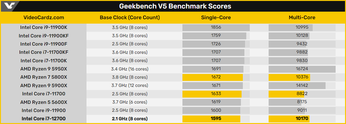 Благодаря утечкам известно, что Intel Core i7-12700K предложит восемь больших ядер с поддержкой Hyper-Threading и четыре малых ядра. Между тем, Geekbench 5 определил Core i7-12700 в качестве 8-ядерного/16-поточного CPU. Этому есть два возможных объяснения: в процессоре деактивированы все энергоэффективные ядра или бенчмарк ещё не полностью совместим с Intel Alder Lake-S.