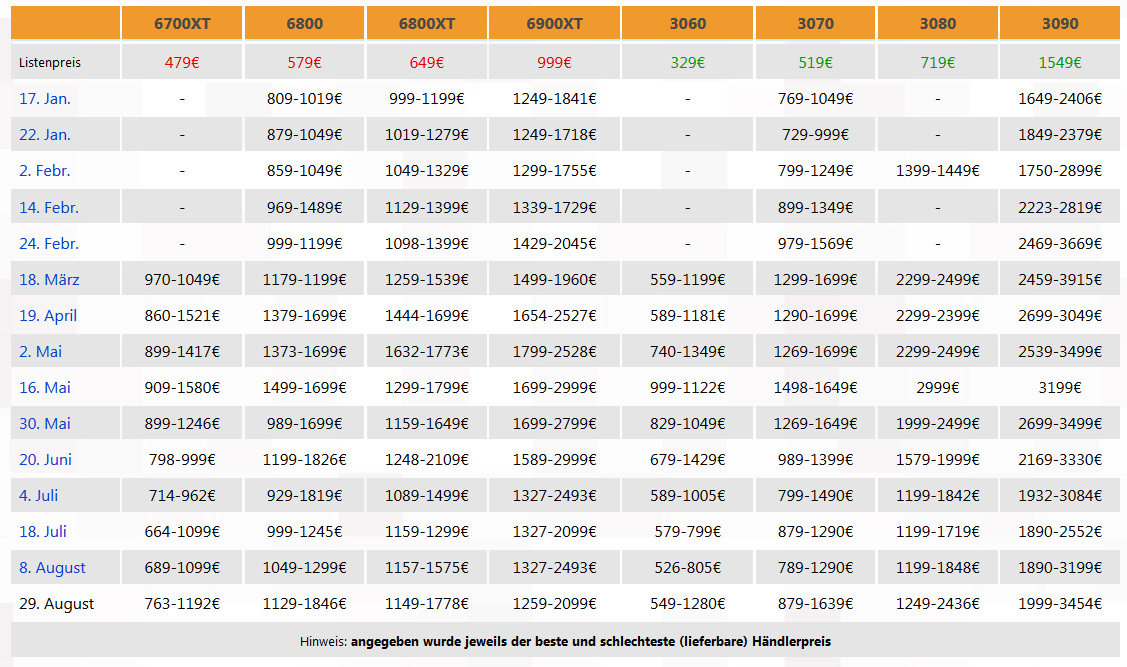 Портал 3DCenter выпустил свежий отчет о состоянии рынка игровых видеокарт в Германии. Беглый обзор демонстрирует последовательный рост цен на ускорители у всех популярных немецких розничных продавцов.