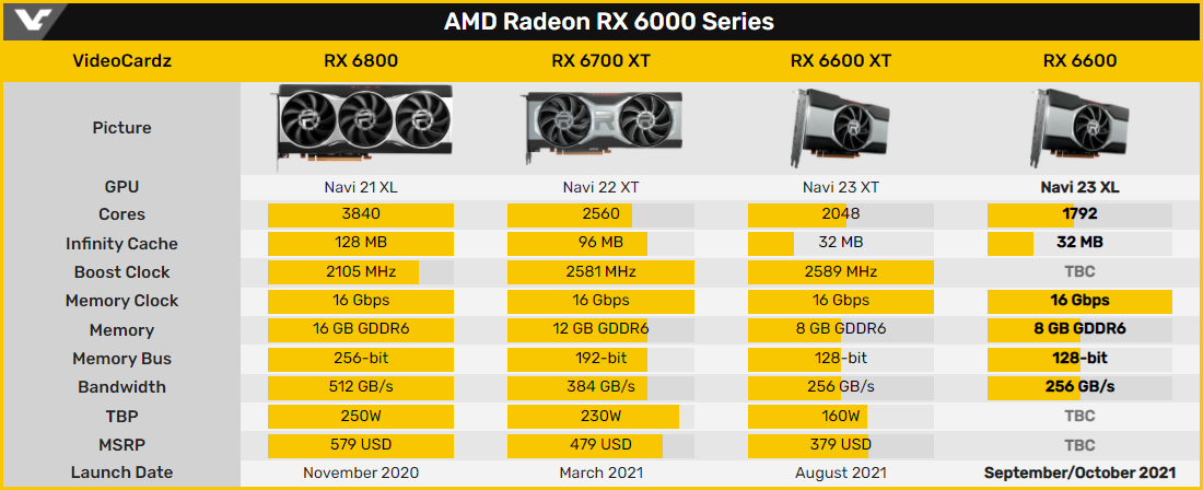 Основой Radeon RX 6600 послужил урезанный 7-нм кристалл Navi 23 в конфигурации с 1792 потоковыми процессорами, 32-мегабайтным буфером Infinity Cache и 128-разрядной шиной памяти. Видеокарта оснащается 8 гигабайтами GDDR6 с пропускной способностью 256 Гбайт/с. Официальный дебют новинки состоится в конце этого или начале следующего месяца.